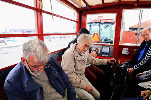 Efter fællesspisning på færgen landede vi på Omø lidt i 12, hvor traktorbussen ventede på os, for at tage os med rundt på Omø, inden vi igen kl. 14:00 gik ombord på færgen og sejlede tilbage til Stigsnæs Færgehavn.